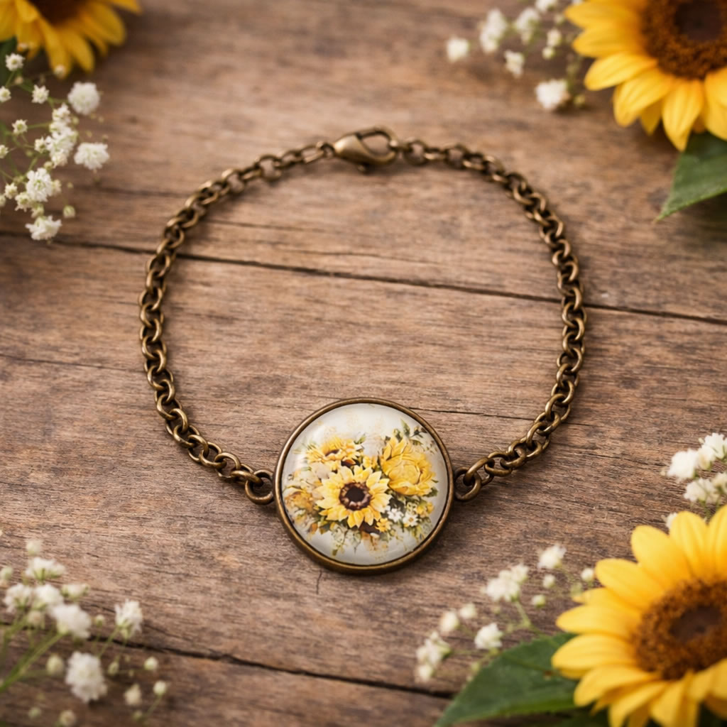 Aceasta bratara Floarea Soarelui bronz cu cabochon de sticla este un accesoriu delicat inspirat din simbolistica luminii, energiei pozitive si vitalitatii. Floarea Soarelui este asociata cu optimismul, forta interioara si orientarea catre echilibru si armonie, transformand aceasta bratara intr-o bijuterie cu semnificatie profunda si expresiva.