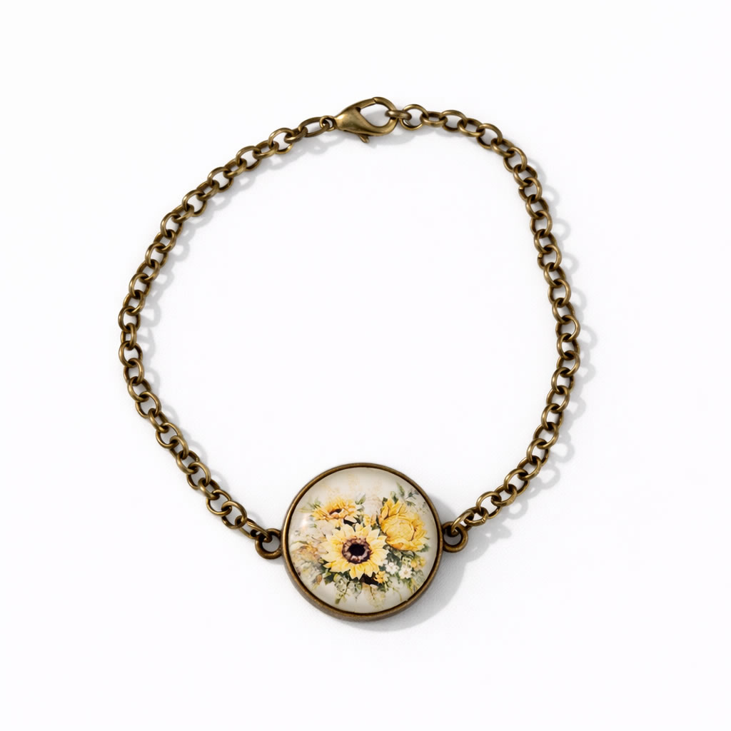 Elementul central este protejat de un cabochon din sticla, care ofera claritate si profunzime modelului floral, pastrand in acelasi timp un aspect elegant si rafinat. Nuanta bronz adauga un aer cald si vintage, oferind bratarii un farmec aparte si facand-o usor de asortat cu tinute variate, de la stil casual la elegant.