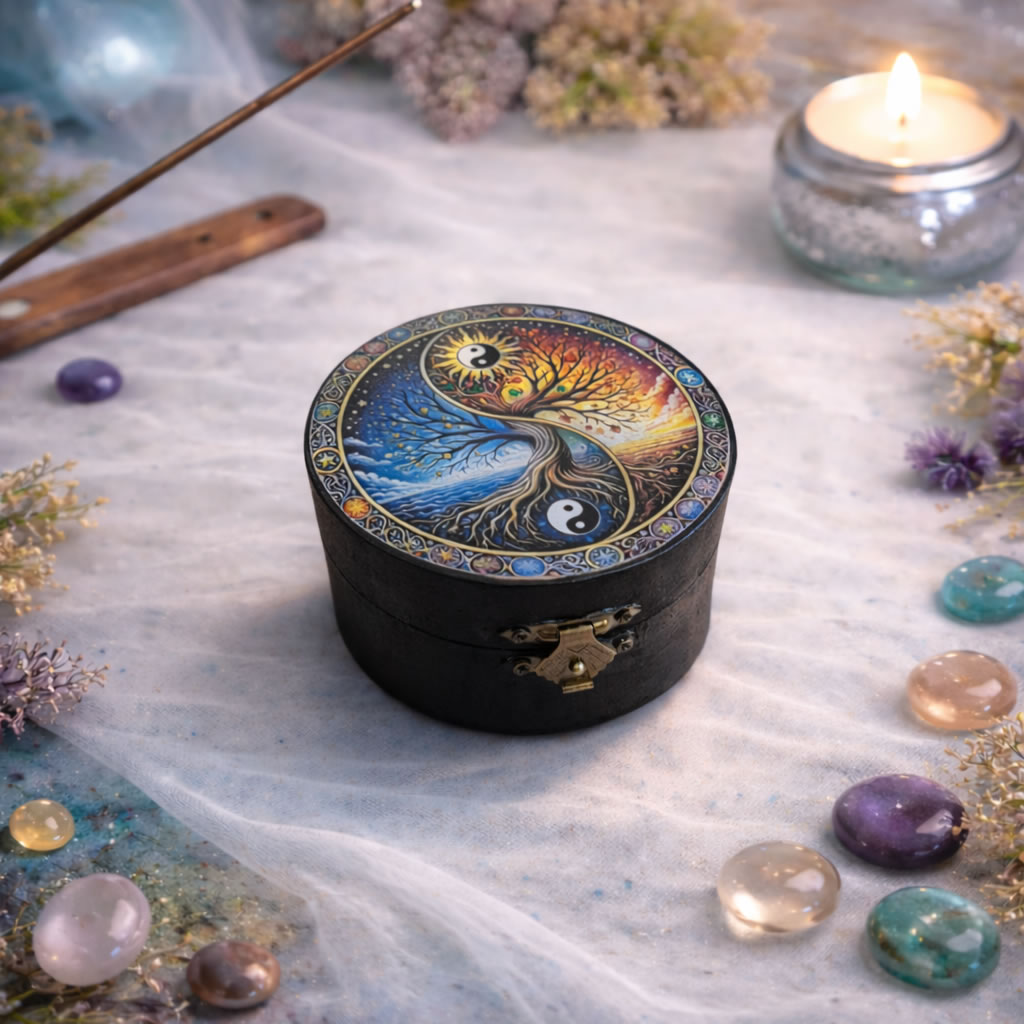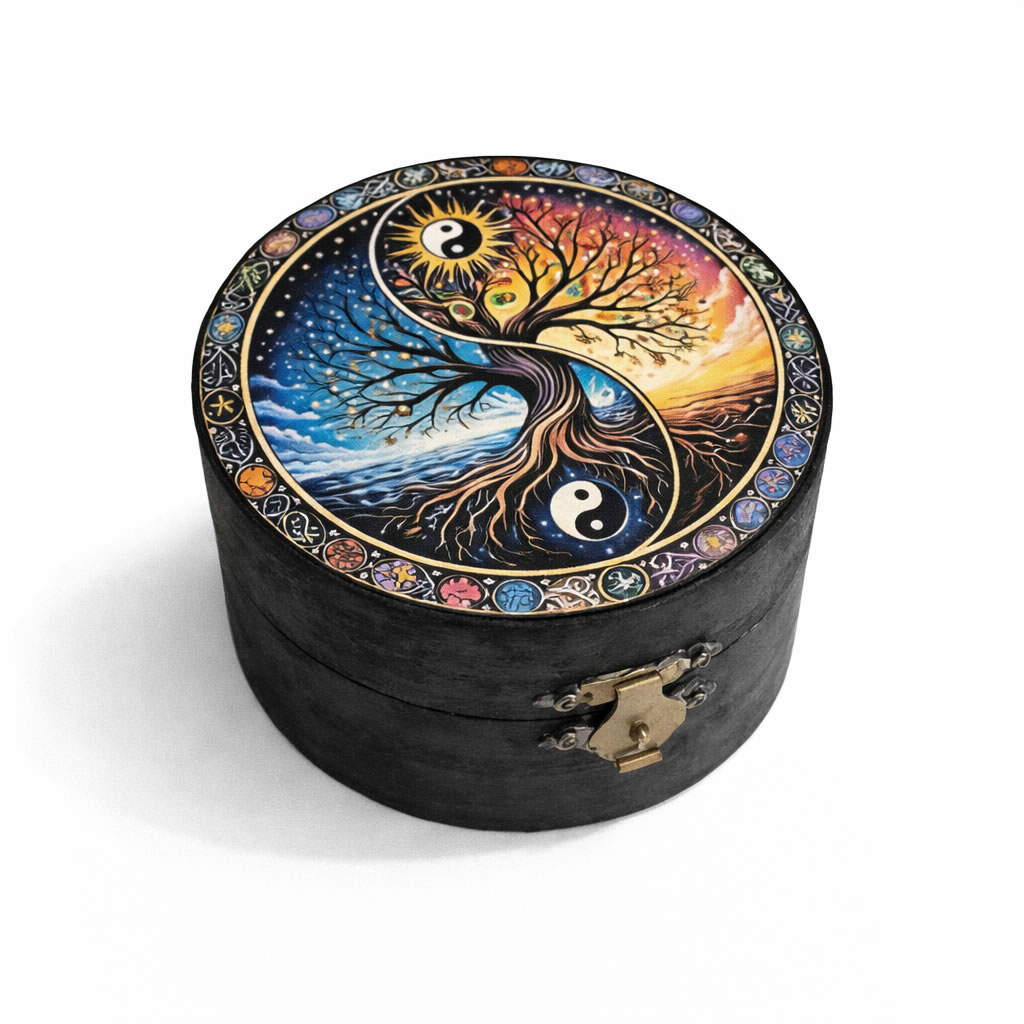 Cutie rotundă din lemn cu simbol Yin Yang sipomul vietii este un obiect decorativ cu semnificație profundă, creat pentru a aduce armonie, echilibru și liniște în orice spațiu. Realizată din lemn natural, această cutie îmbină simplitatea materialului cu forța simbolului Yin Yang – reprezentarea echilibrului dintre energii opuse și complementare.