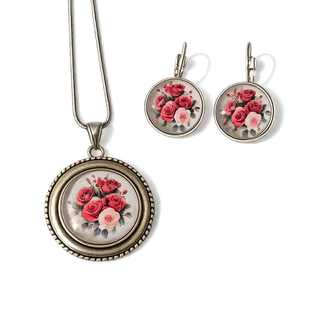 Suprafata lucioasa a cabochonului din sticla creeaza un efect de profunzime si luminozitate, punand in valoare detaliile fine ale trandafirilor si conferind bijuteriilor un aspect delicat si artistic. Setul este potrivit atat pentru purtare zilnica, cat si pentru ocazii speciale, adaugand o nota romantica si rafinata oricarei tinute.