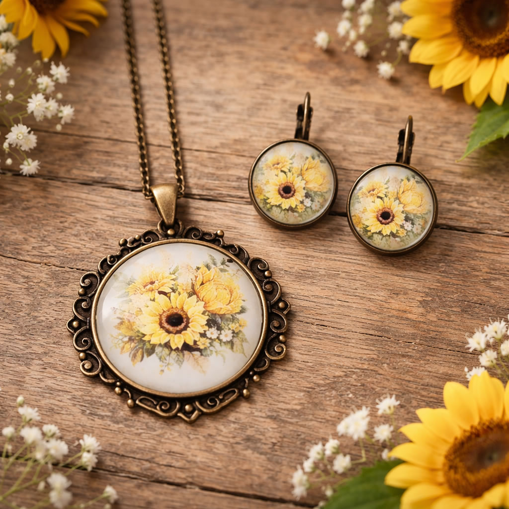 Acest set bijuterii Floarea Soarelui pandantiv si cercei bronz cu cabochon de sticla evidentiaza frumusetea si simbolistica profunda a uneia dintre cele mai luminoase flori. Setul este format din pandantiv si cercei in nuanta bronz, protejati de un cabochon din sticla care ofera profunzime, claritate si un aspect elegant.