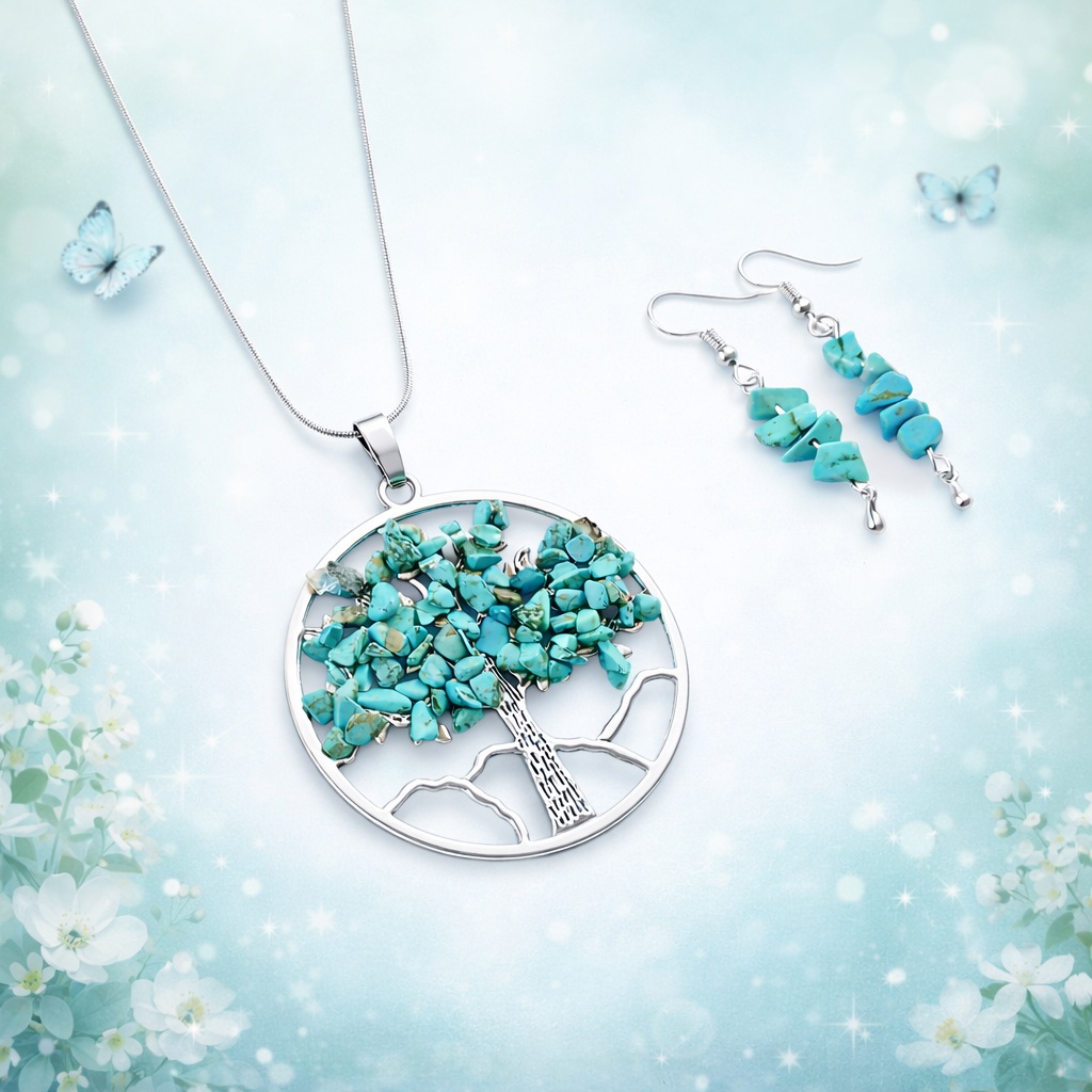 Acest set de bijuterii Pomul Vietii cu turcoaz imbina simbolistica profunda cu eleganta naturala, fiind o alegere inspirata pentru femeile care apreciaza armonia, protectia si frumusetea autentica.