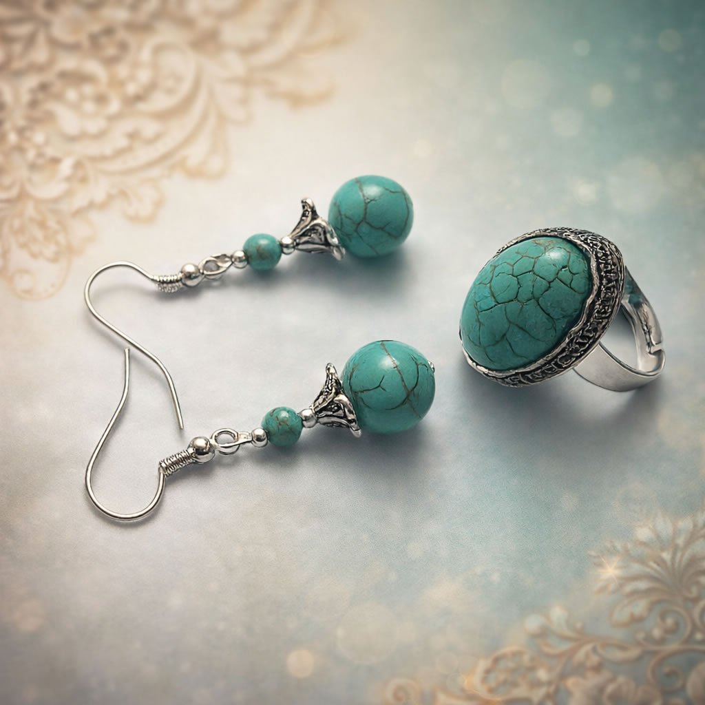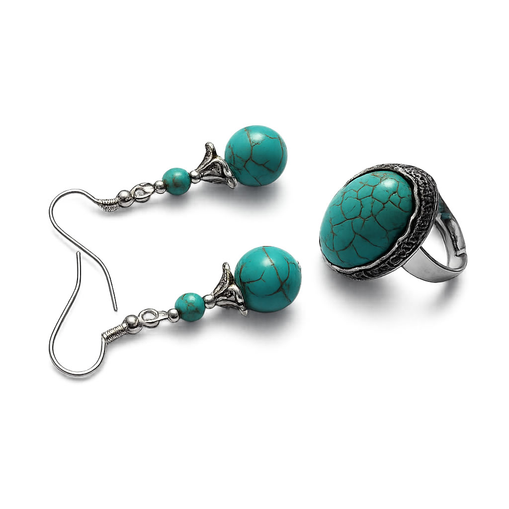 Fie ca este purtat ca set complet sau separat, acest set de bijuterii cu turcoaz adauga un accent elegant si vibrant, completand armonios orice stil vestimentar.
